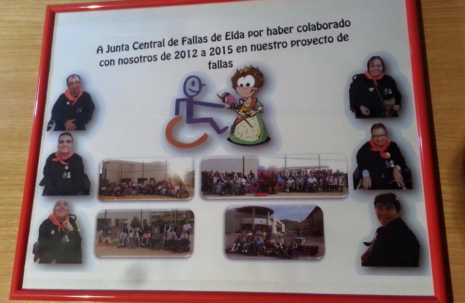Ena la tarde del sábado las Falleras Mayores de Elda y sus Damas de Honor, han asistido a la cremá de la IV falla realizada por los residentes del CAI COCEMFE ALICANTE de Petrer, entidad que ha entregado un cuadro a Junta central, agradeciendo así la colaboración en el proyecto de realización de fallas