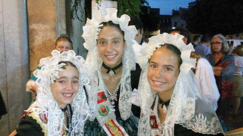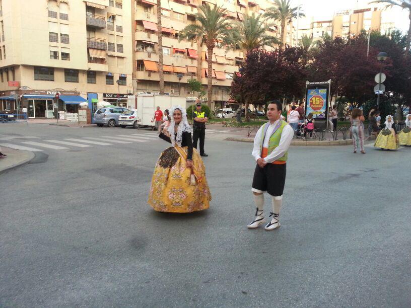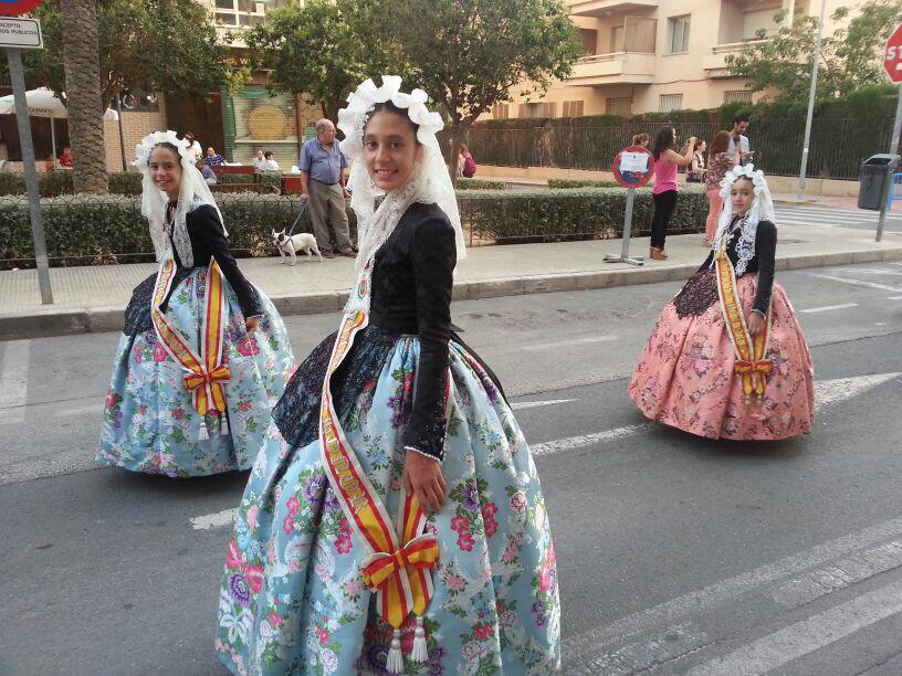 Las Falleras Mayores de Elda, Lorena Bravo Molina y Marina Pérez García, junto con sus Damas de Honor y varios miembros de Junta Central de Fallas, asistieron al Pasacalles del Fuego en honor a San Juan Bautista, organizado por el Ayto. De San Juan de Alicante.