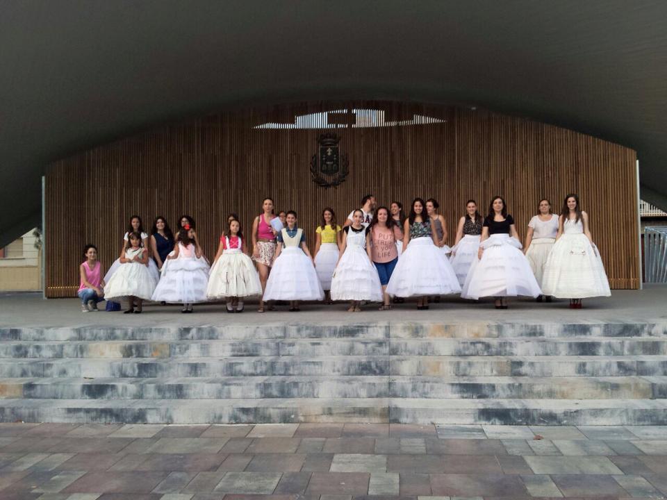 Las candidatas a Falleras Mayores de Elda en su primer ensayo en la Plaza Castelar, donde el 11 de julio se celebrará la elección.