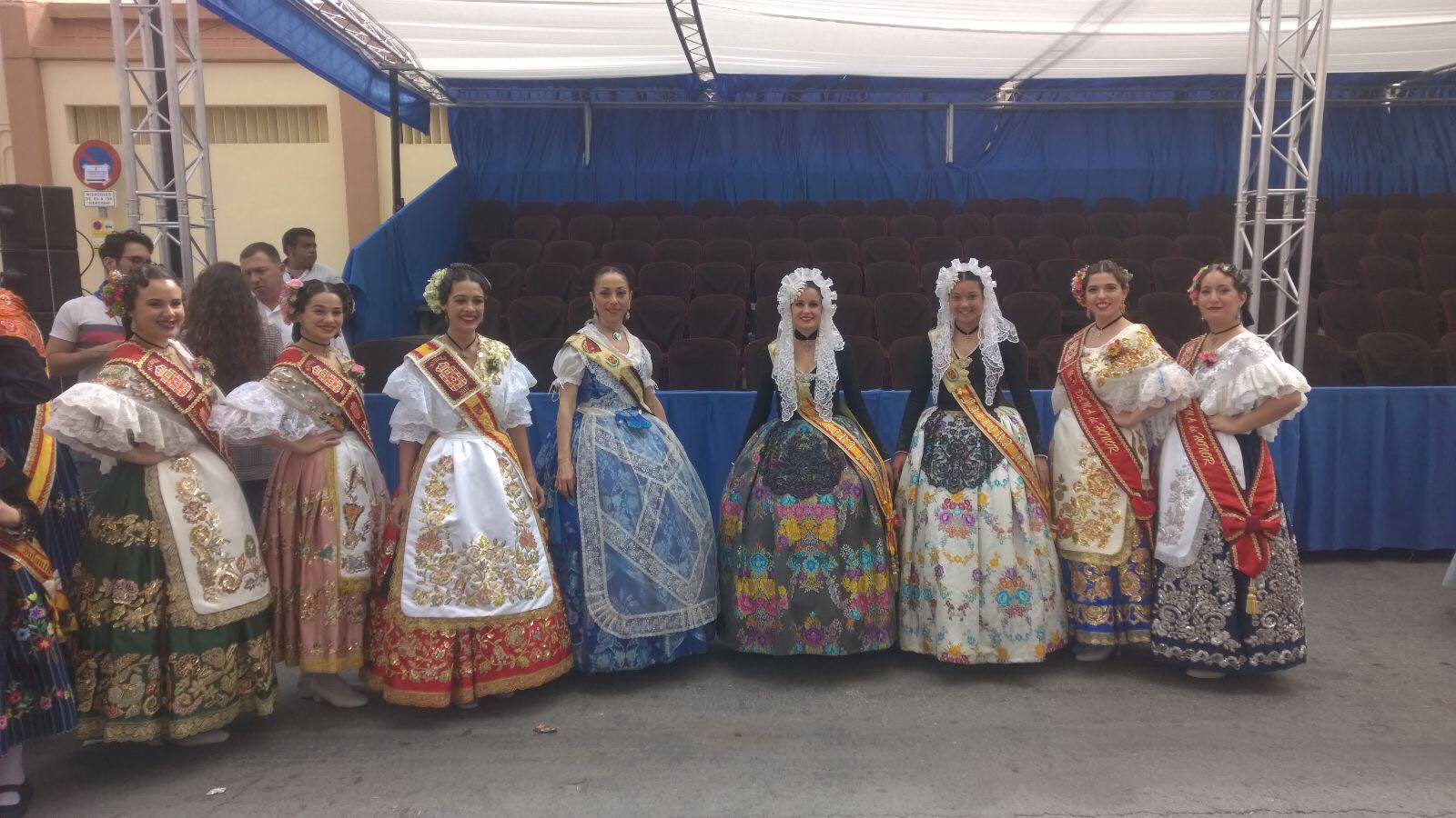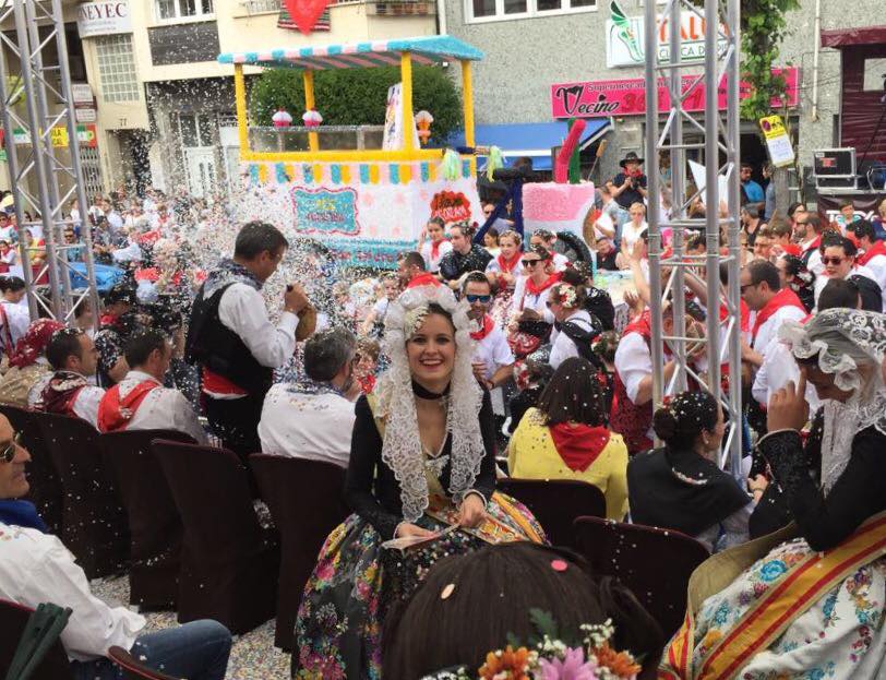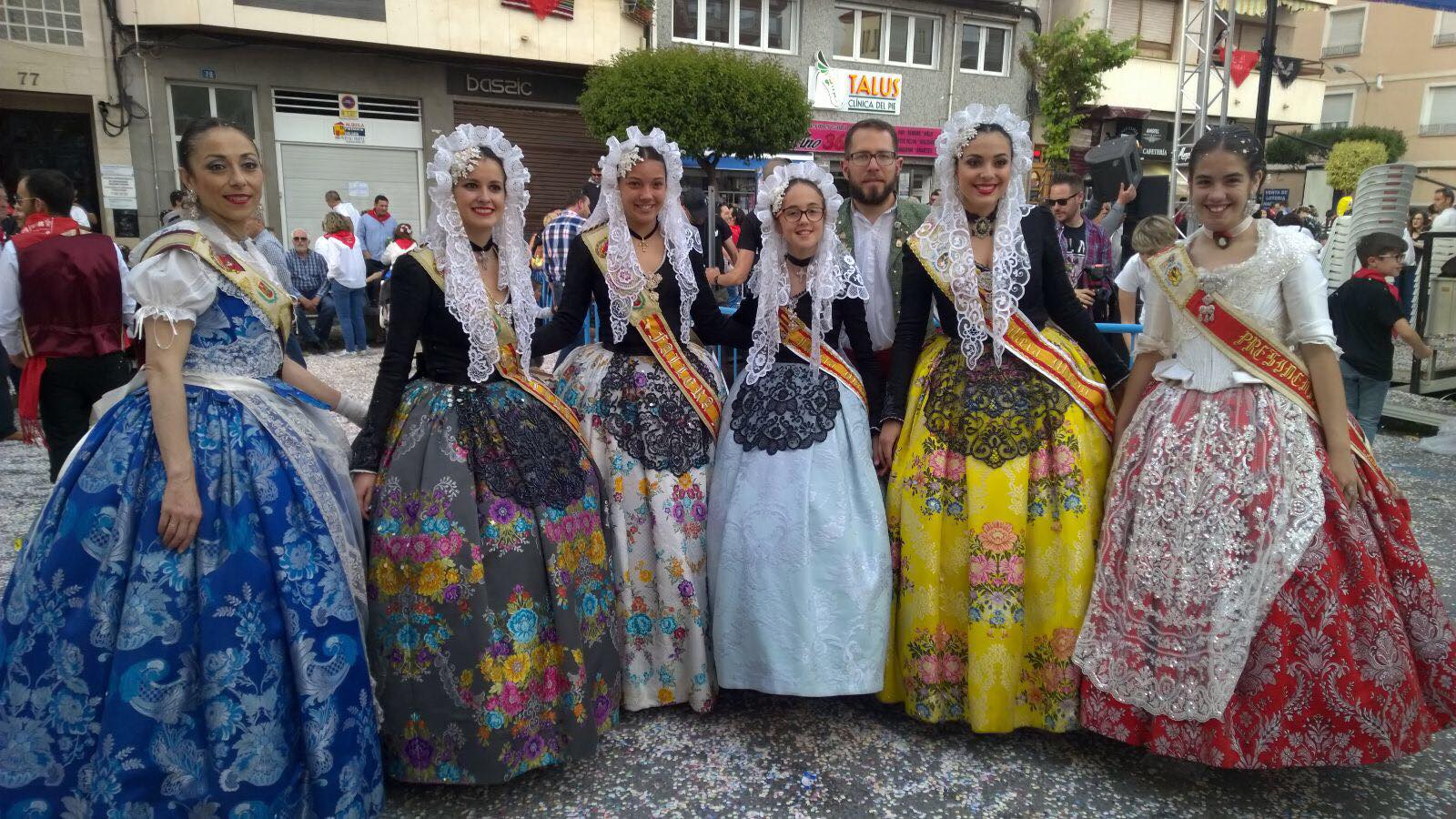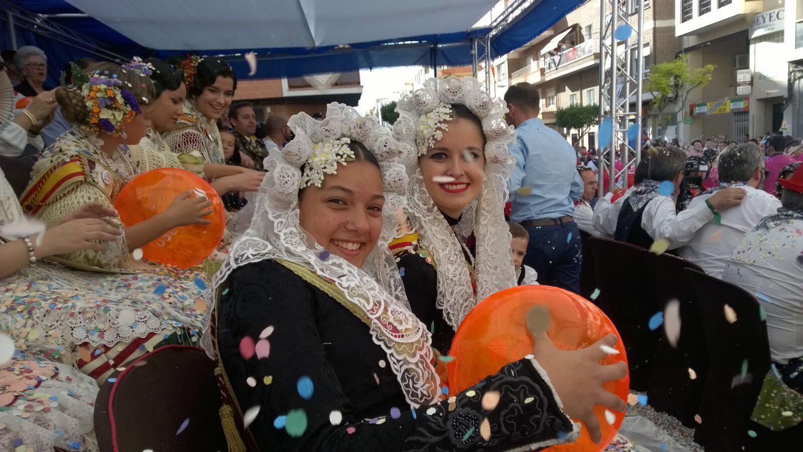 Las falleras mayores de Elda, Esther y Andrea, estuvieron invitadas a la tribuna de autoridades en las Fiestas de San Isidro de Yecla para disfrutar de su colorido y artesanal desfile de carrozas.