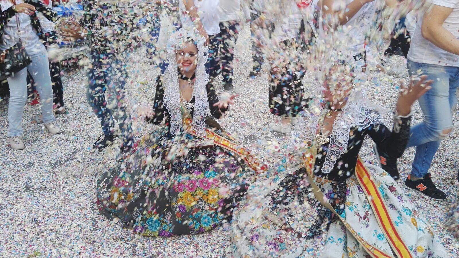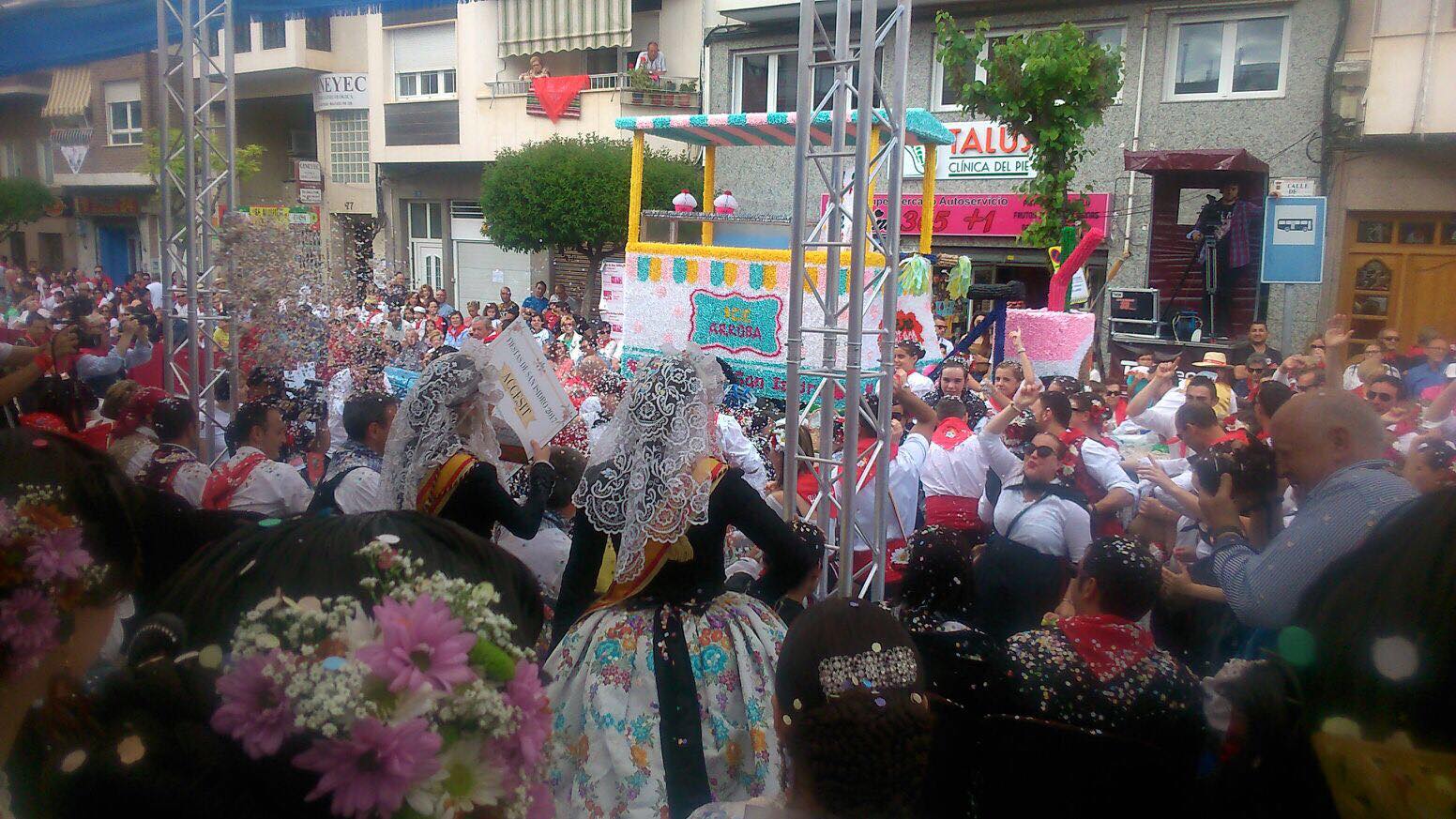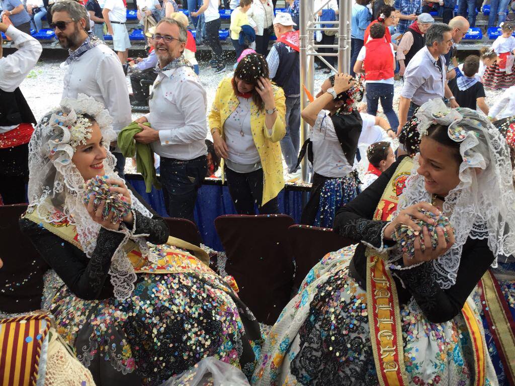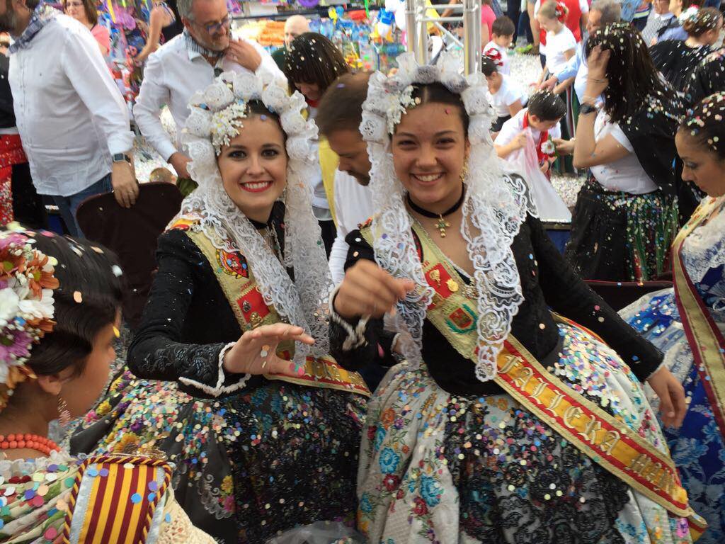 Las falleras mayores de Elda, Esther y Andrea, estuvieron invitadas a la tribuna de autoridades en las Fiestas de San Isidro de Yecla para disfrutar de su colorido y artesanal desfile de carrozas.