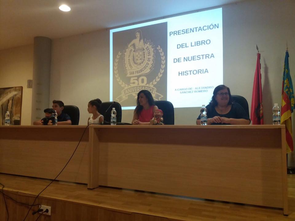La Fallera Mayor de Elda ha asistido a la presentación de la revista especial de la Falla San Francisco de Sales, editada con motivo de su 50 aniversario. Así como a la exposición conmemorativa instalada en el hall del Centro Cívico y Juvenil.