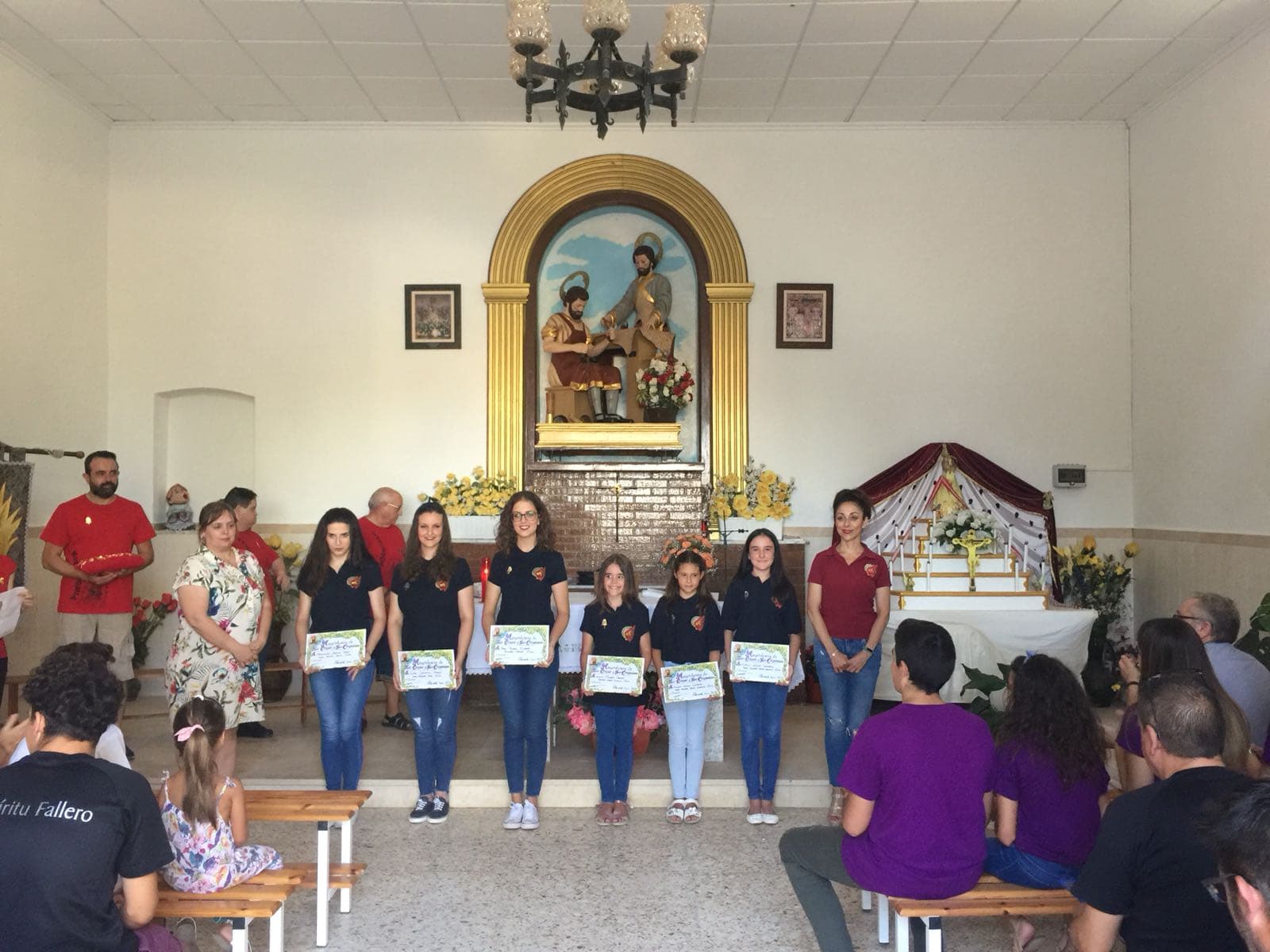 Las Falleras Mayores de Elda y sus Damas de Honor acompañaron a la Mayordomía de San Crispin y San Crispiniano, Elda. en la tradicional misa de campaña, donde les impusieron la máxima distinción de la entidad.
