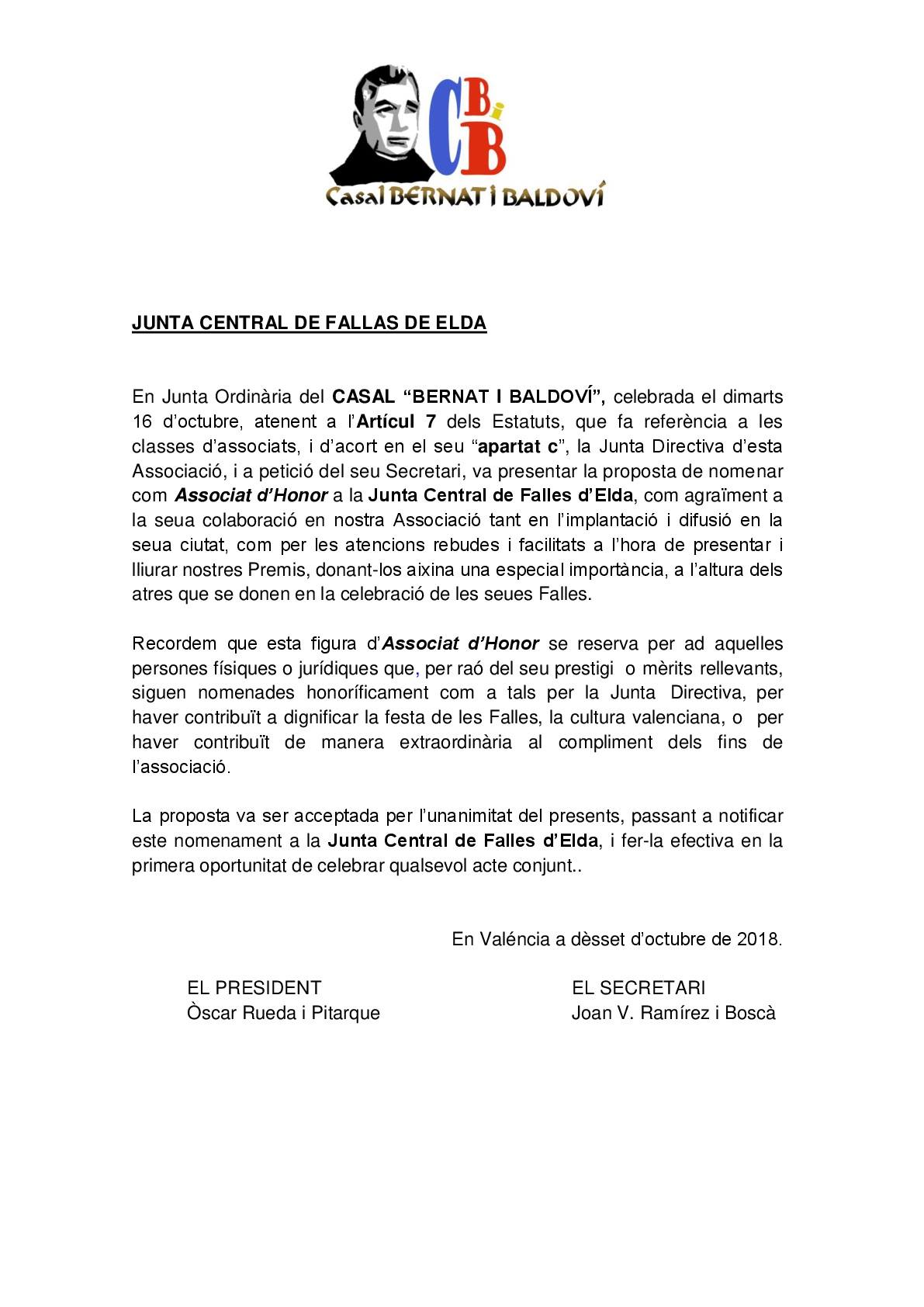 Es para nosotros un placer anunciaros que el Casal Bernat i Baldoví ha nombrado a la Junta Central Fallas Elda, Associat d'Honor.