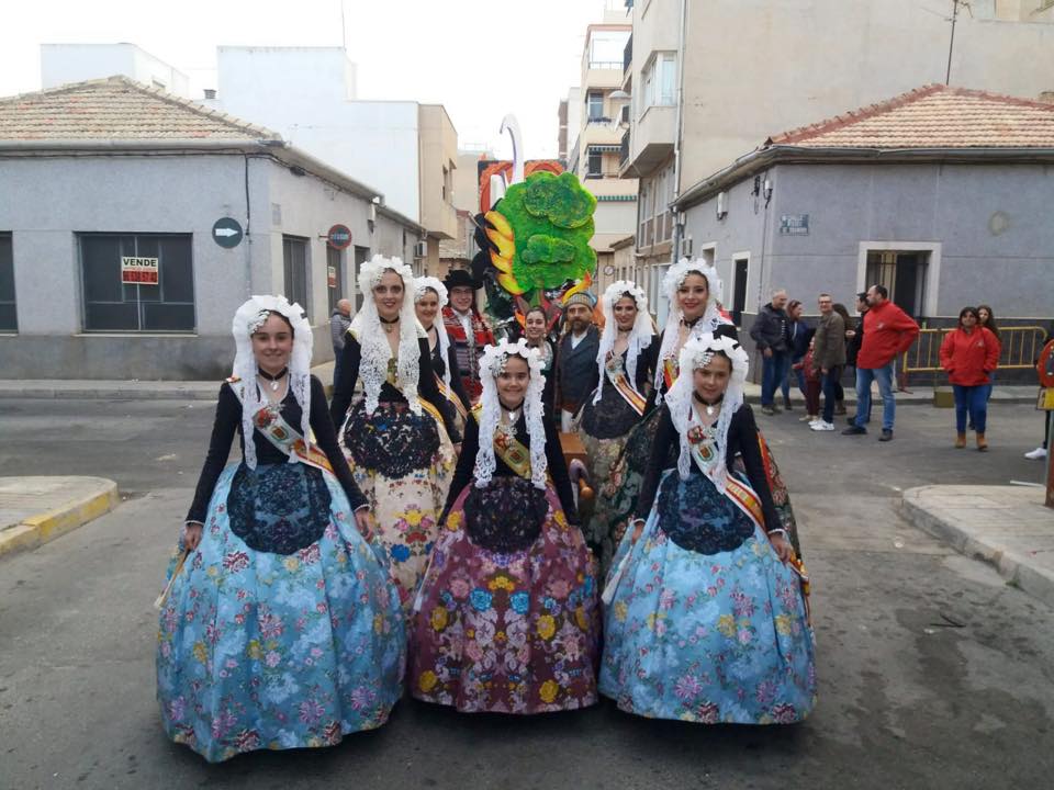 Nuestras Falleras Mayores de Elda y sus Damas de Honor acompañando a la Falla Fraternidad Elda en el pregón y en el desfile de su medio año fallero.
