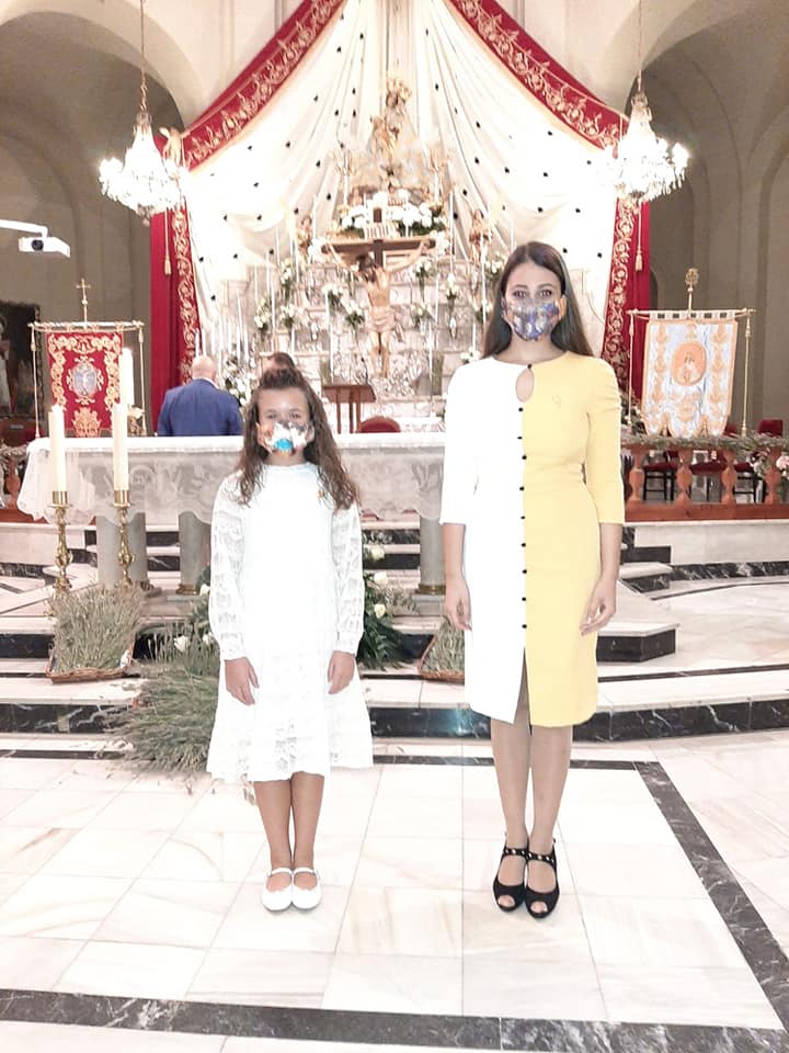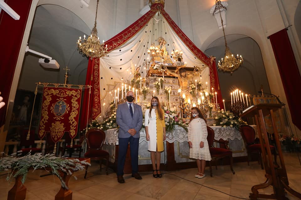 Las Falleras Mayores de Elda en el acto de saluda a la Virgen de la Salud y el Cristo del Buen Suceso, haciendo una ofrenda floral en nombre de las Fallas de Elda.