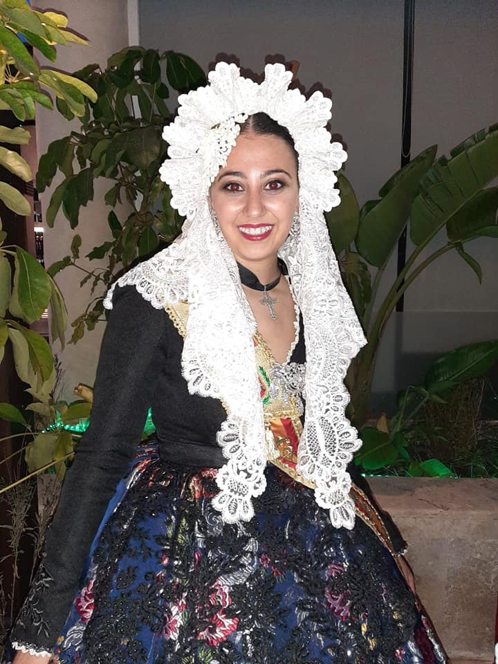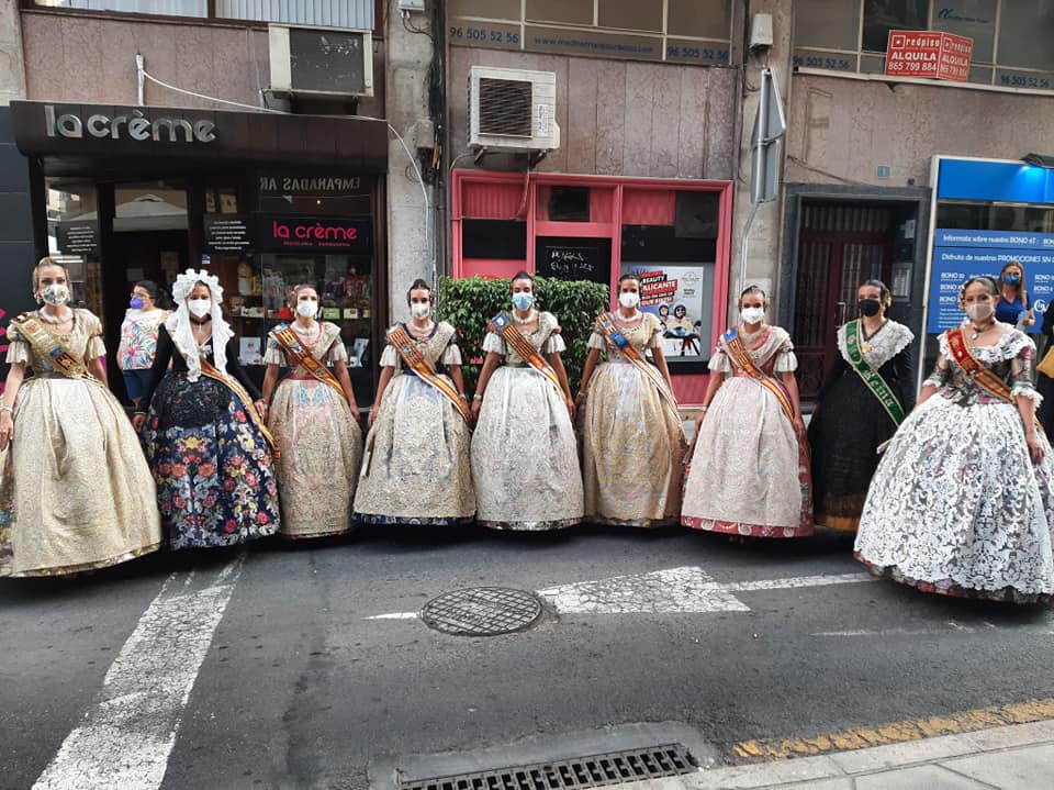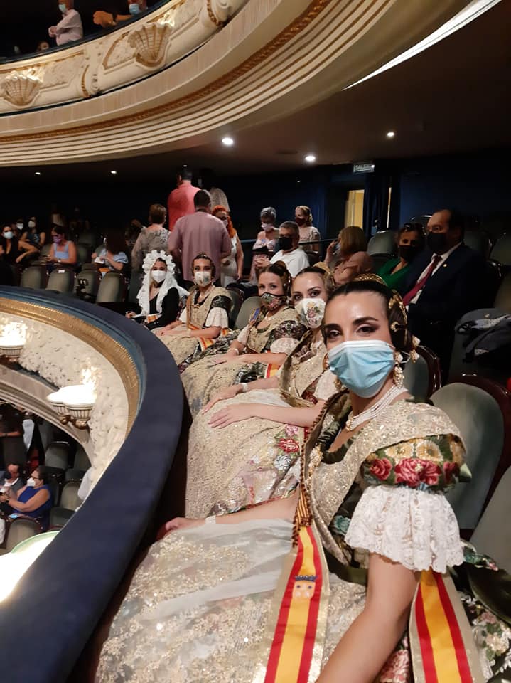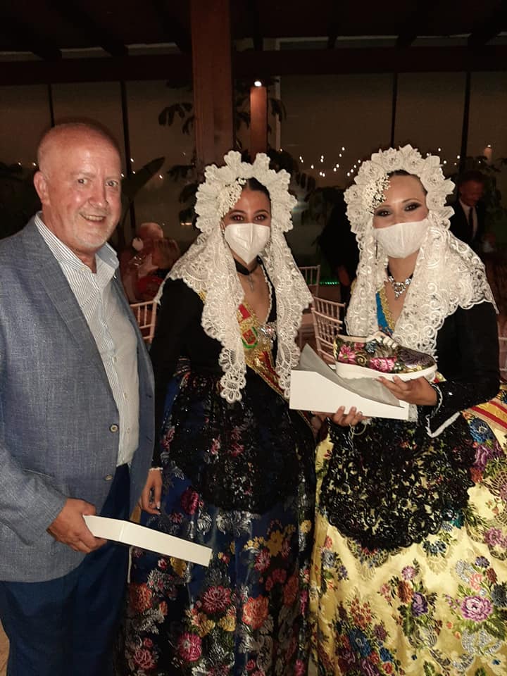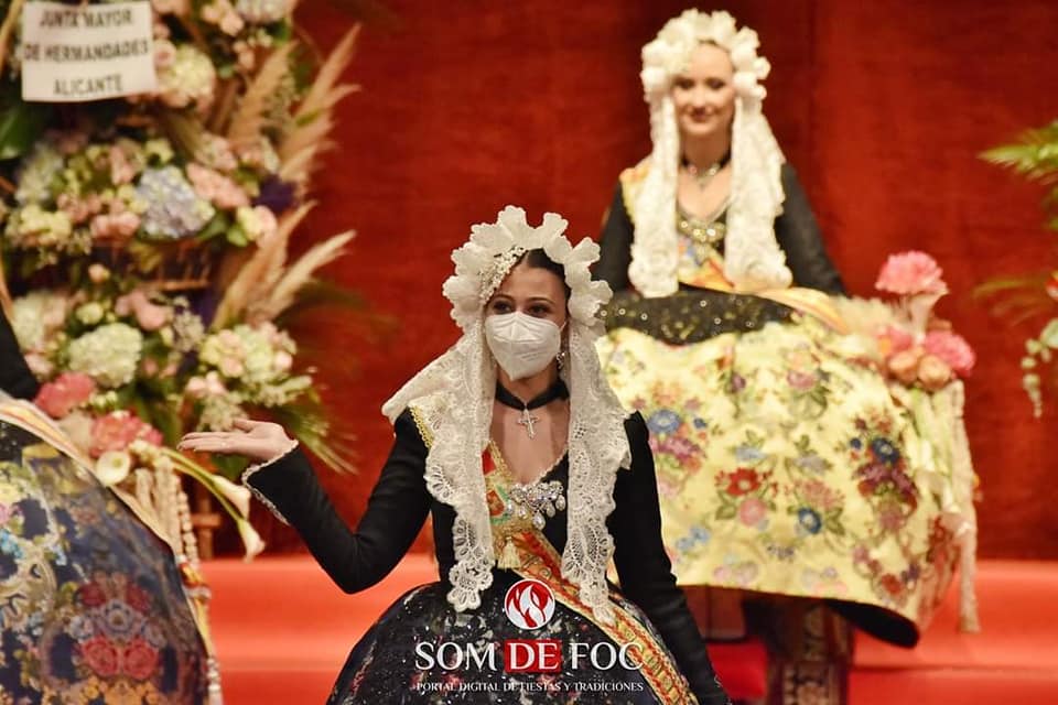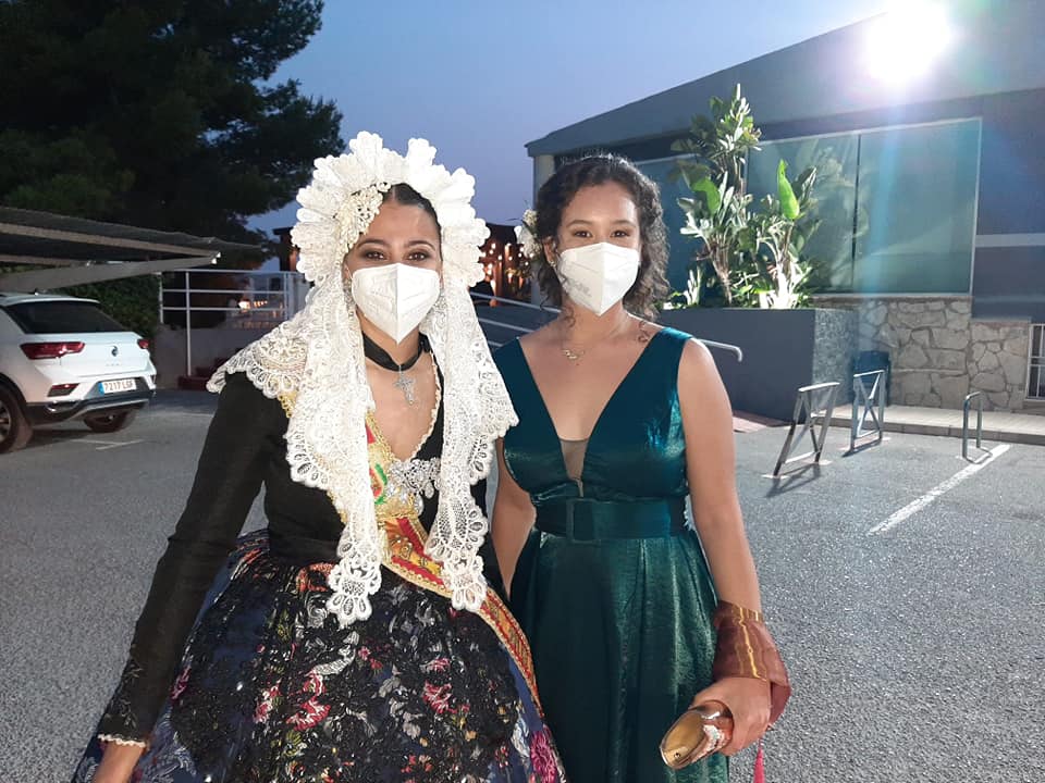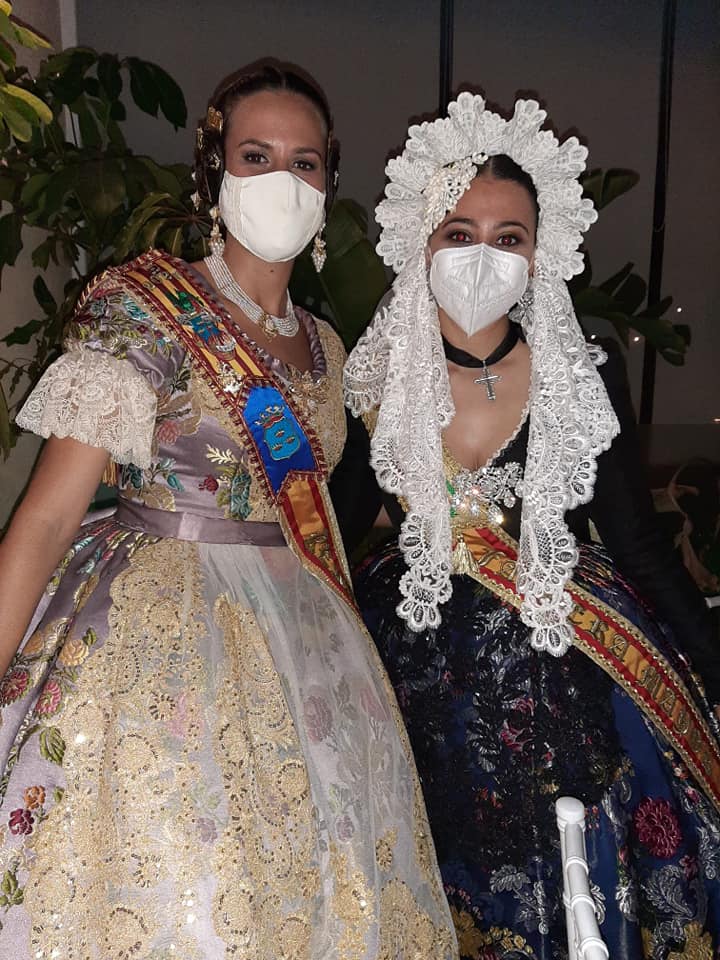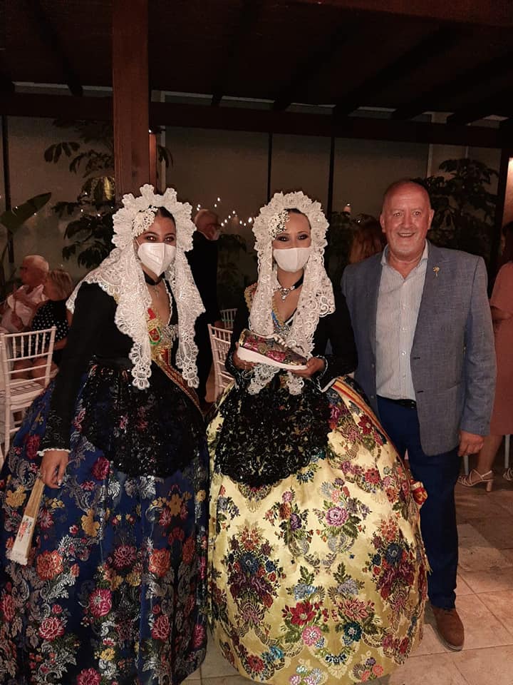Eva Vicente Martinez, fallera mayor de Elda junto a Fernando Alvarez Sempere, presidente de junta gestora, acudieron al acto de proclamación de la bellessa del foc d'Alacant 2022 Marina Niceto Valera.