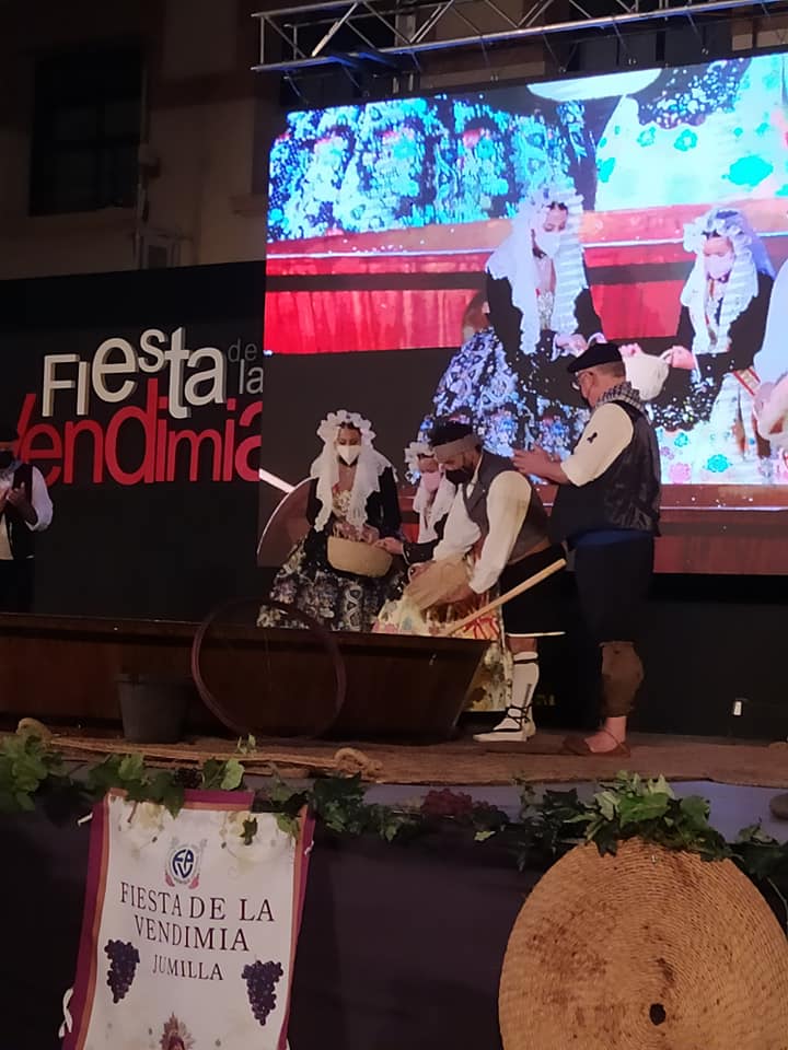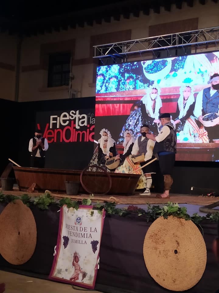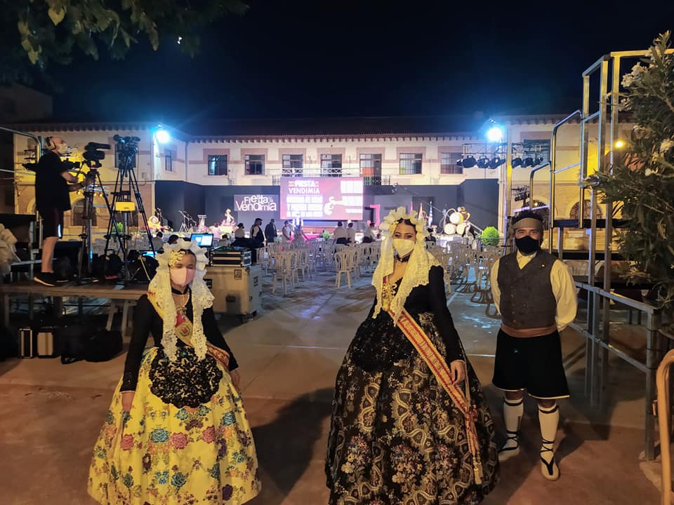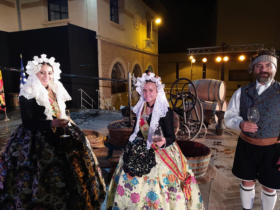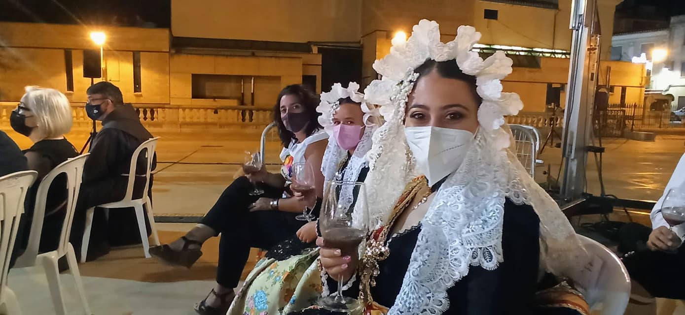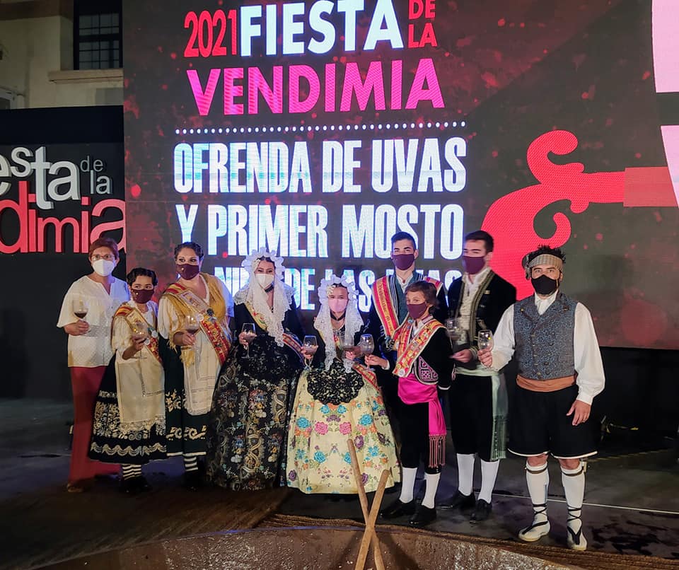 Nahia Tomás Pina y Eva Vicente Martinez, falleras mayores de Elda, acompañadas por Juan José Tebar y Adela Verdú, miembros de Junta Gestora de Fallas, asistieron en Jumilla al acto de ofrenda de uvas y primer mosto al Niño de las Uvas 2021, un tradicional y emotivo acto.