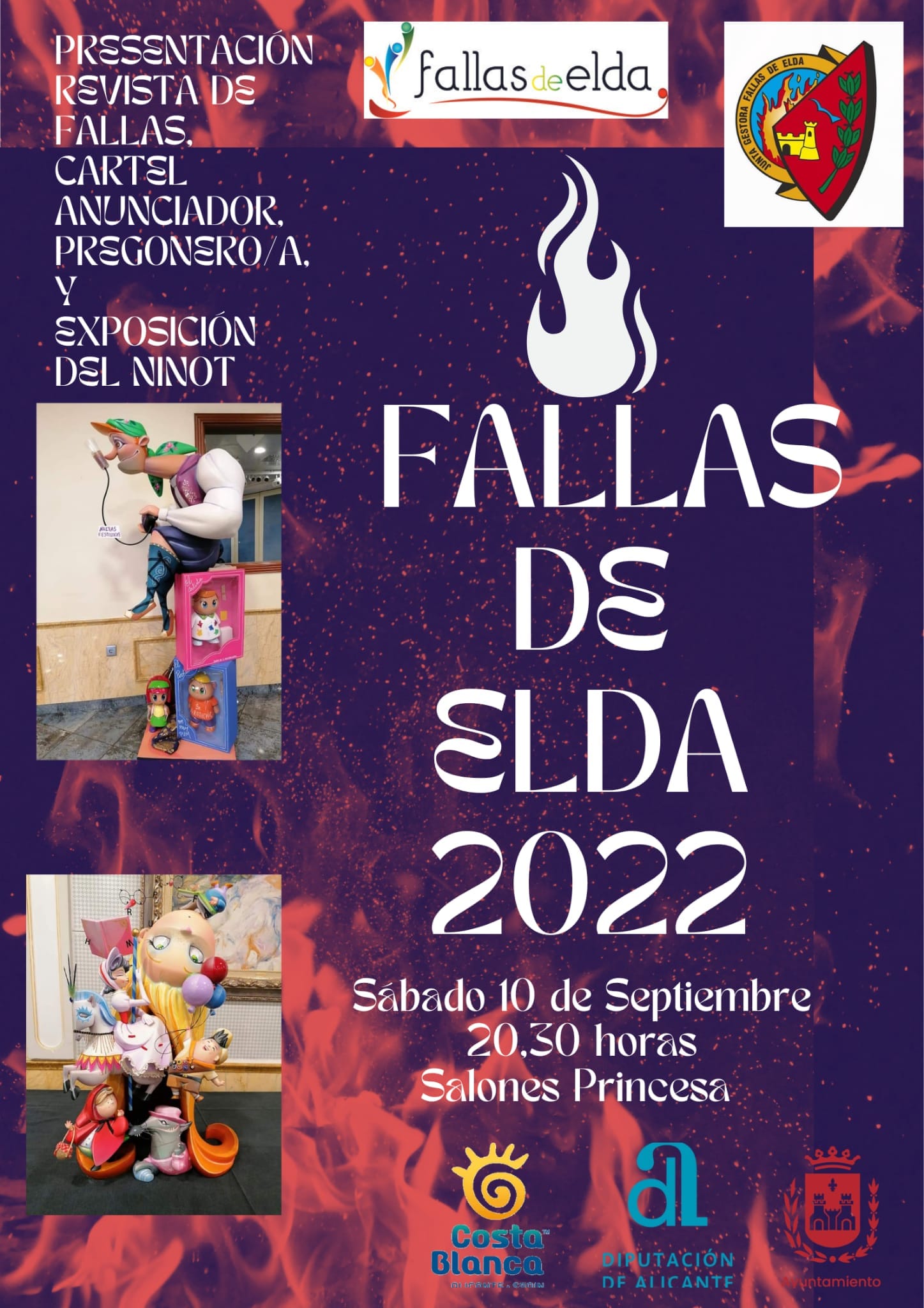 Sábado 10 de septiembre a las 20.30h, en los Salones Princesa, presentación boceto falla oficial, cartel anunciador de las fiestas y libro fallas Elda 2022. Presentación que llevará a cabo Julia María Vera Serna, perteneciente a la Falla Fraternidad Elda. También se dará a conocer al pregoner@ y para acabar se inaugurará la exposición del ninot.