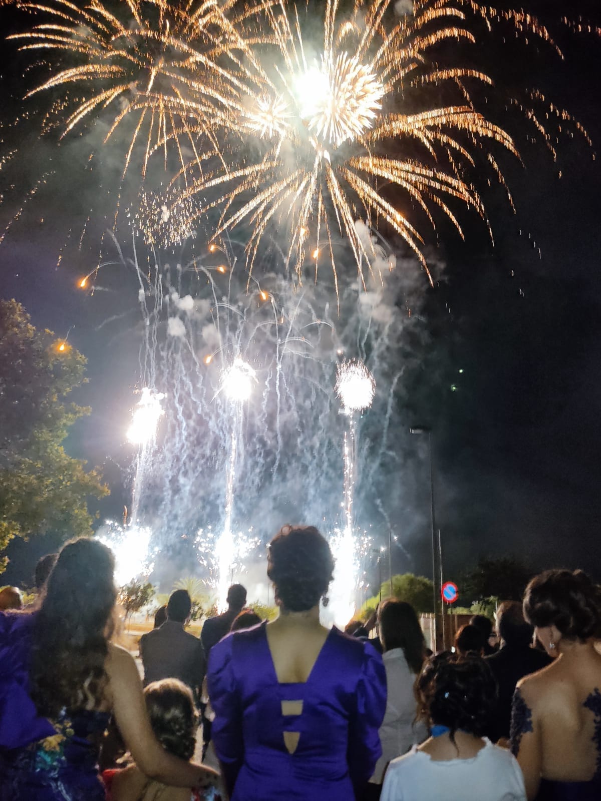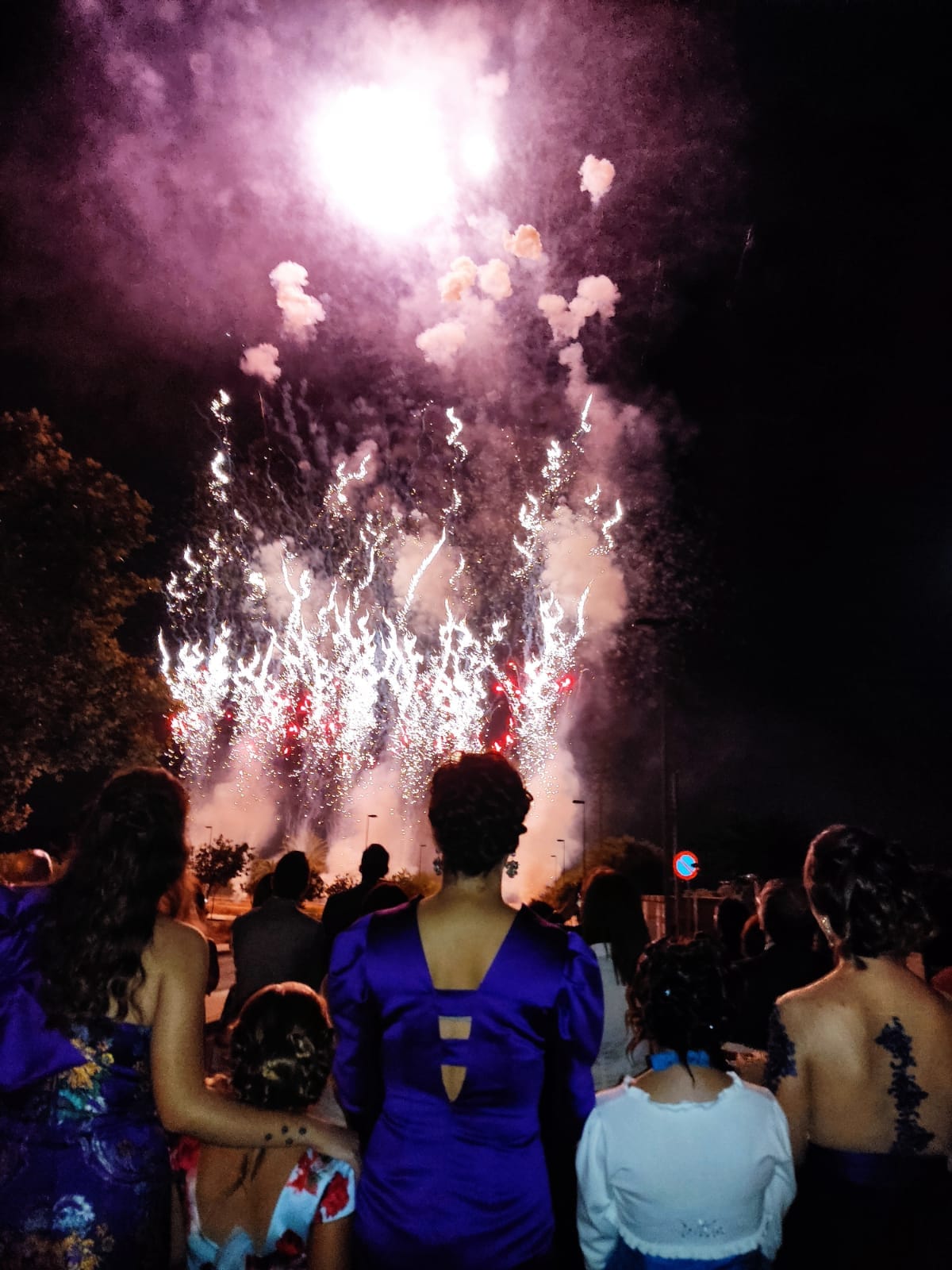 Las falleras mayores de Elda y la presidenta de Junta Gestora, han presenciado la traca de fiestas mayores, desde los balcones de la Casa de Rosas, sede de la Junta Central de Moros y Cristianos Elda.