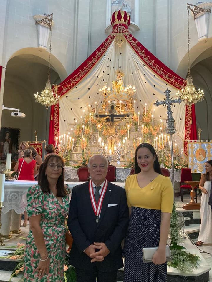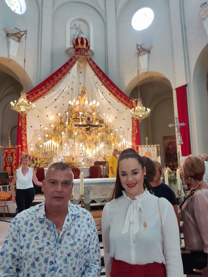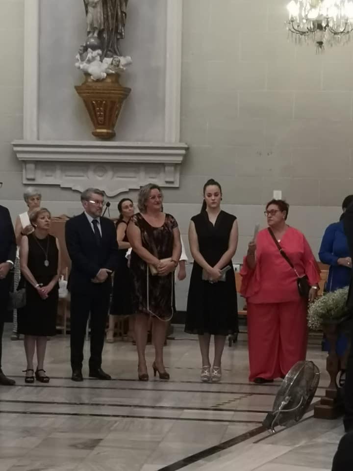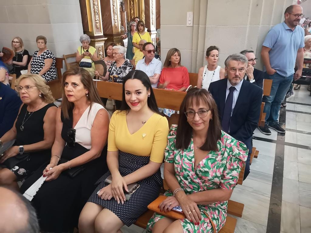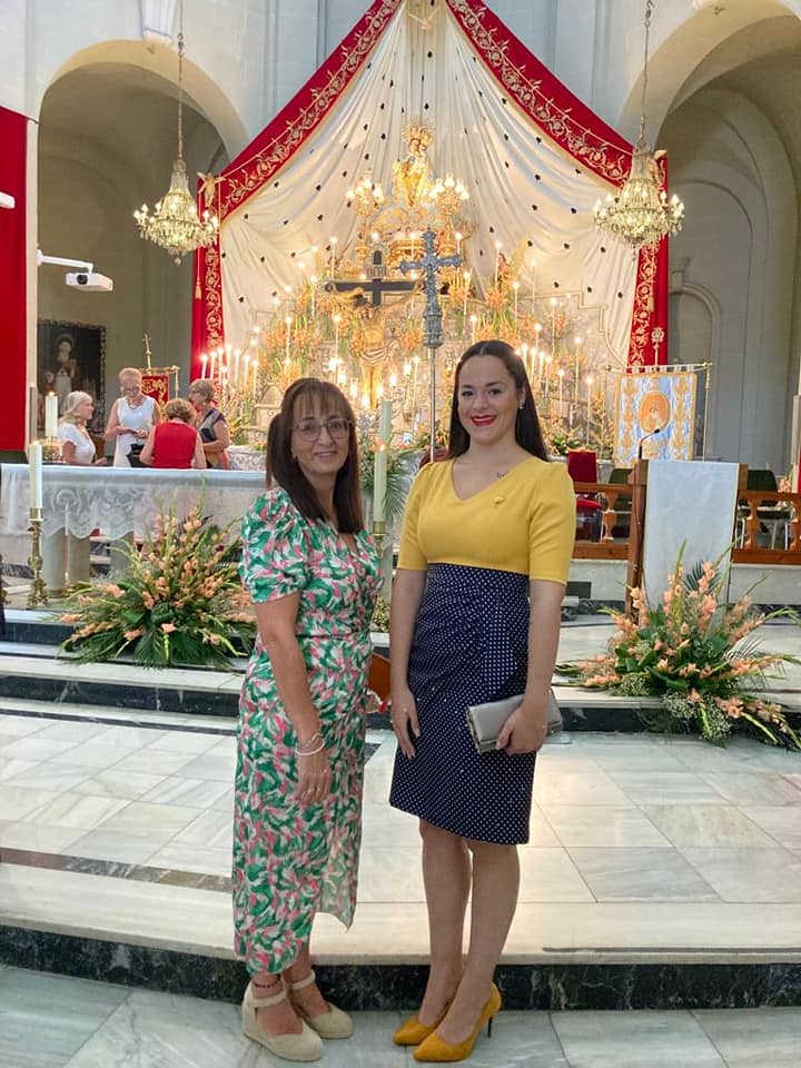 Lucía Giménez Fallera mayor de Elda e Isabel Martínez presidenta de Junta Gestora, han asistido en la iglesia de Santa Ana a la misa en honor a la Virgen de la Salud patrona de la ciudad.