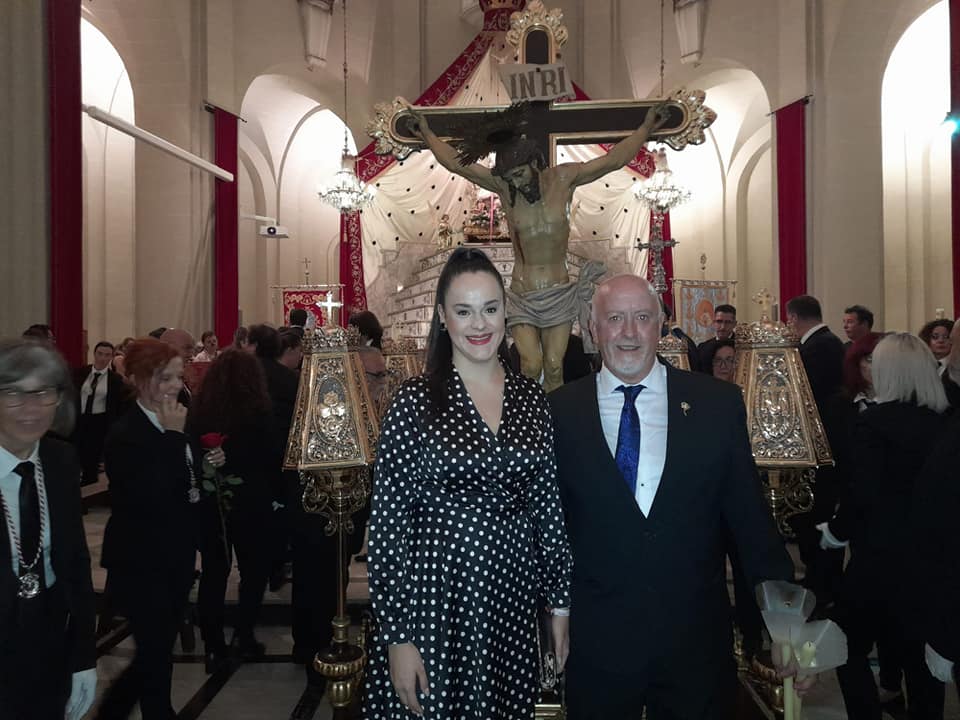 Lucía Giménez Fallera mayor de Elda, acompaña por Fernando Álvarez vicepresidente de Junta Gestora, han participado en la procesión del Santísimo Cristo del buen suceso.