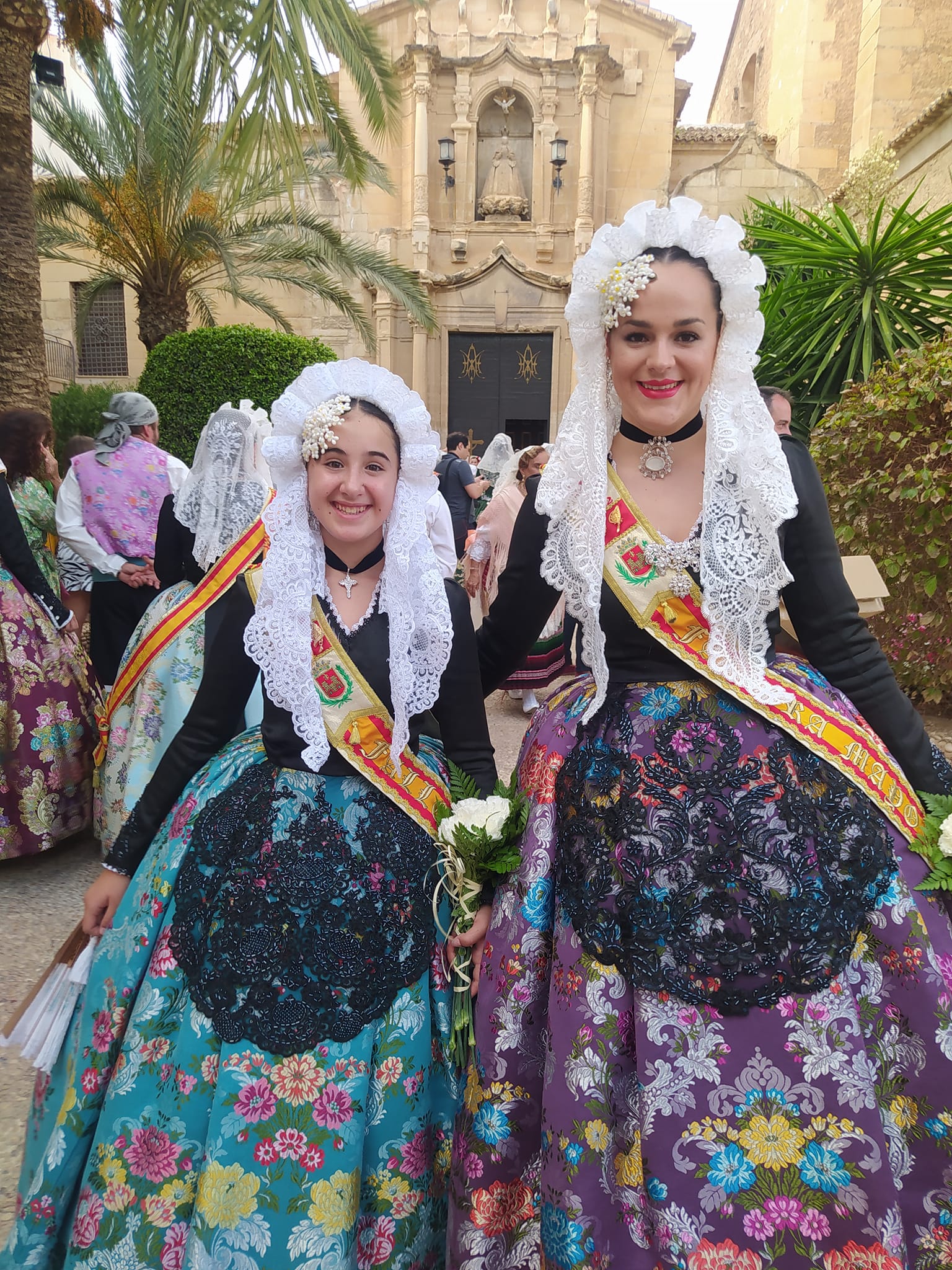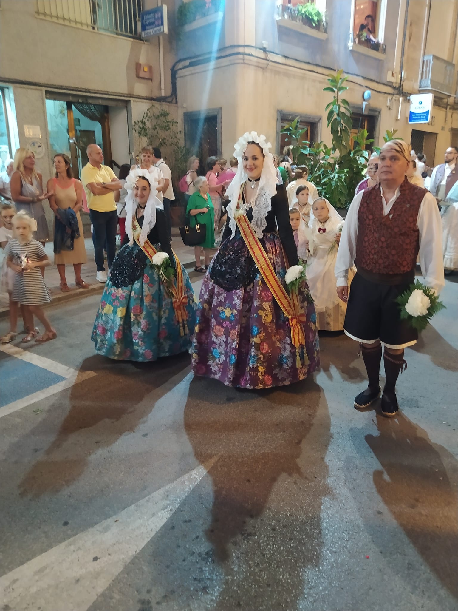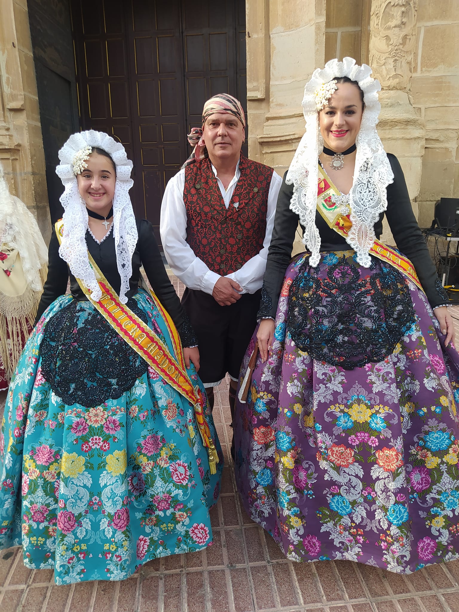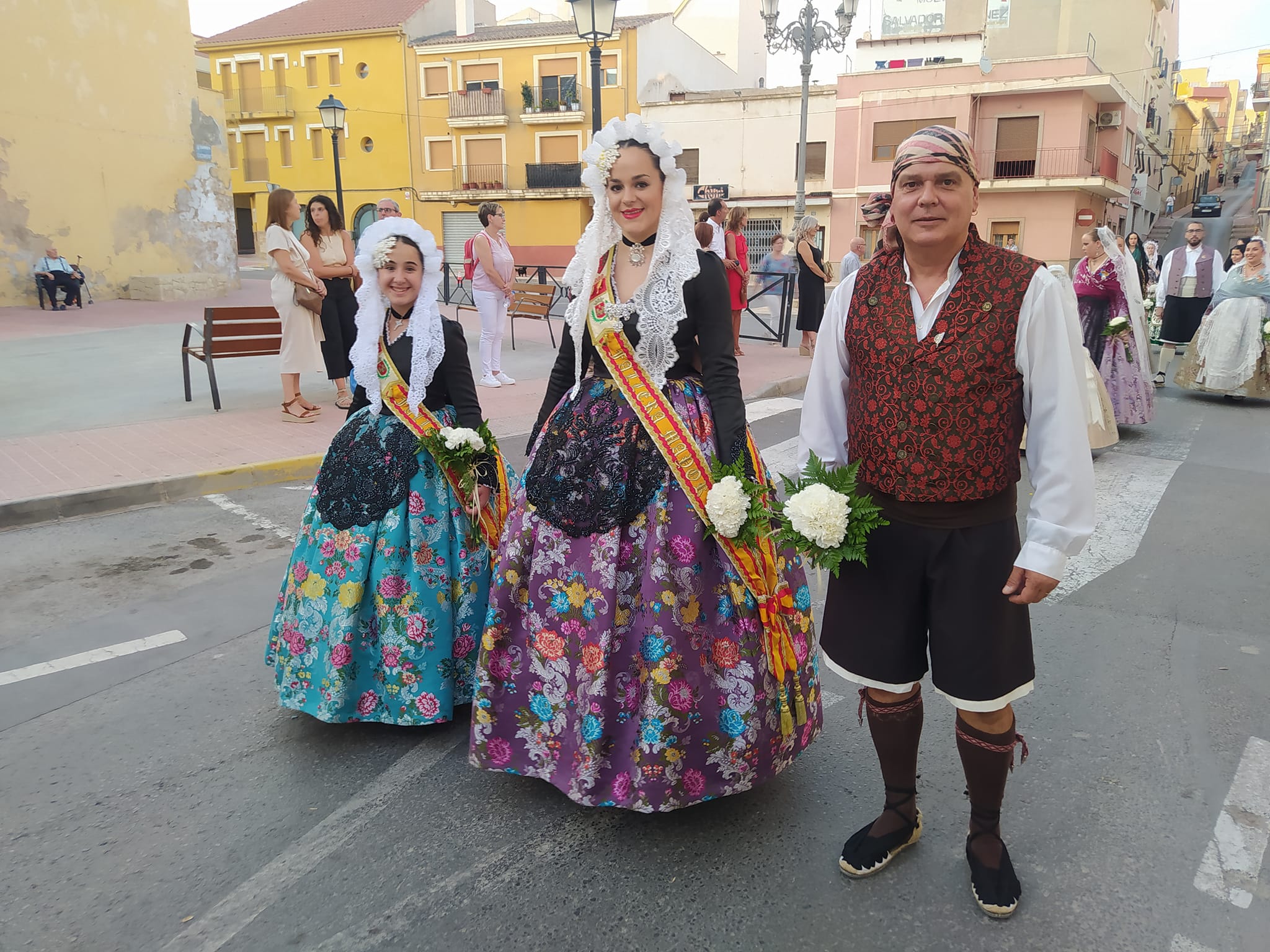 Lucía e Imara falleras mayores de Elda, acompañadas por Juan Pérez miembro de Junta Gestora, han participado en Monóvar a la ofrenda de flores con motivo de sus fiestas mayores.