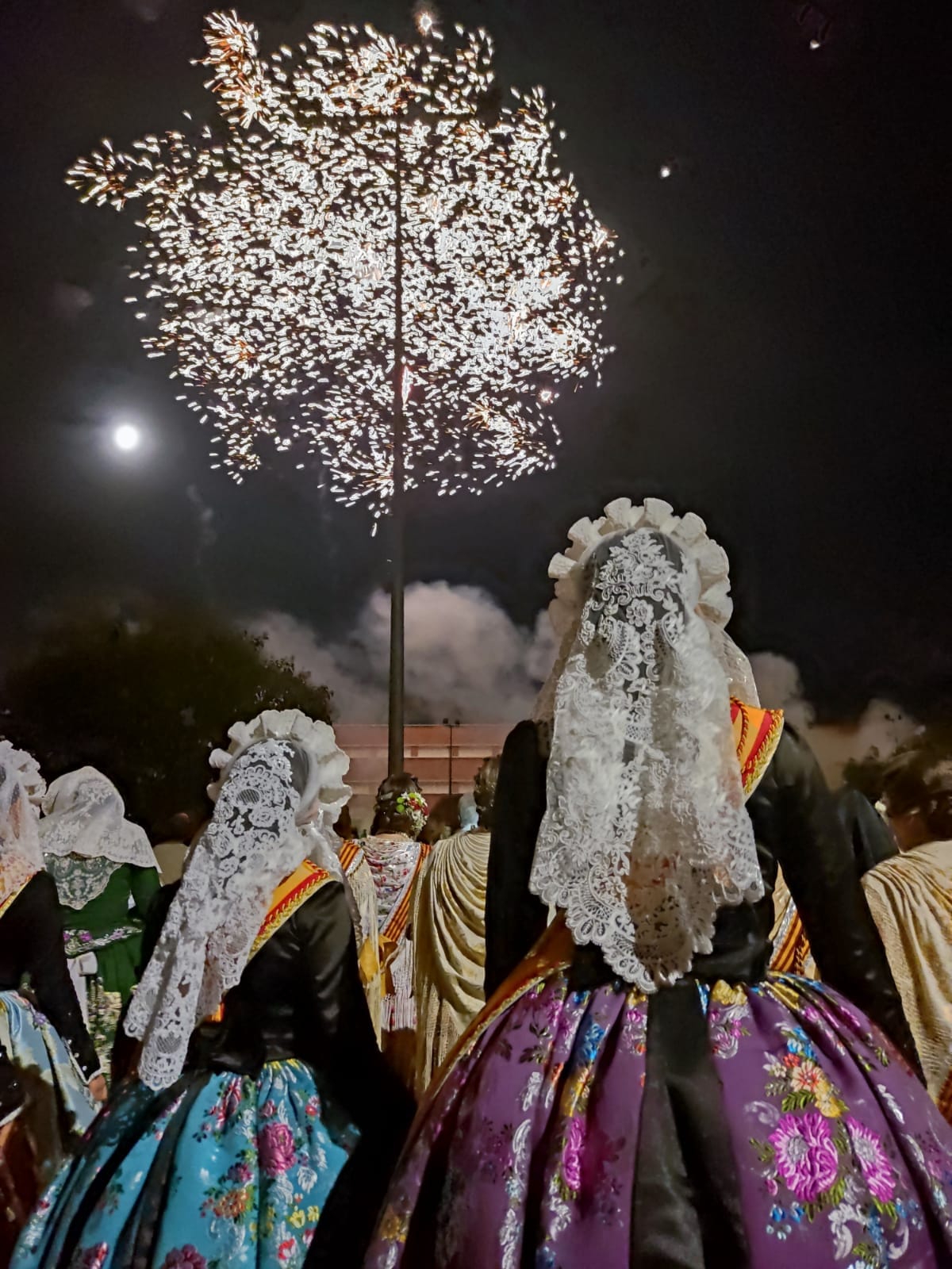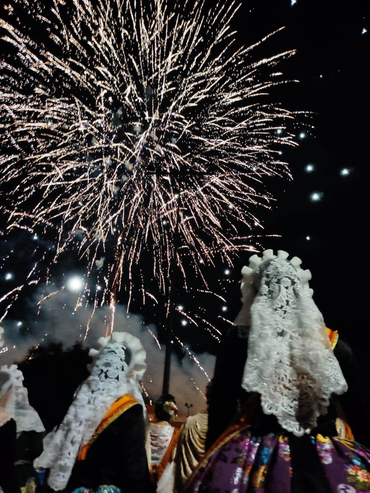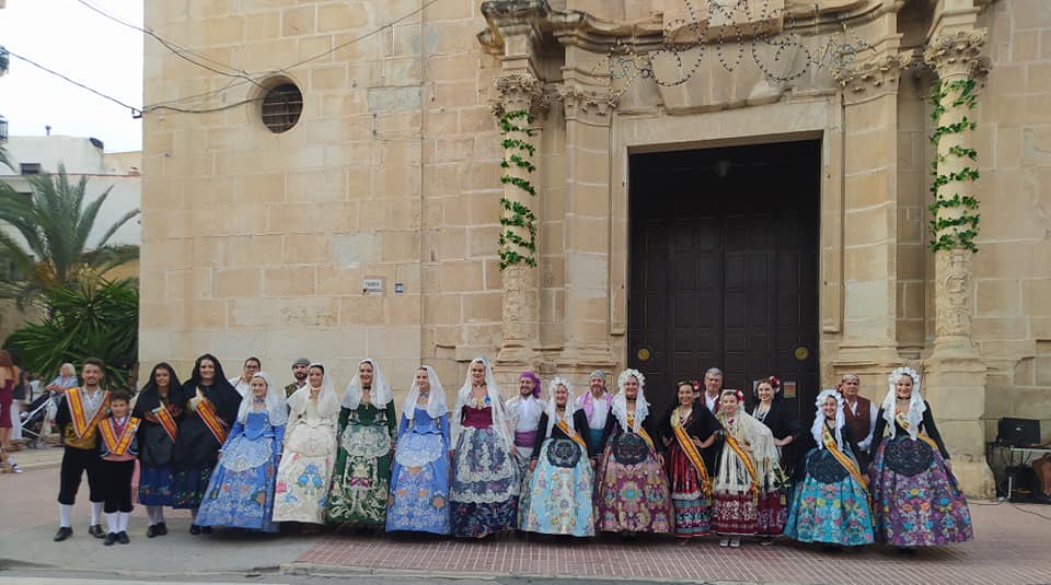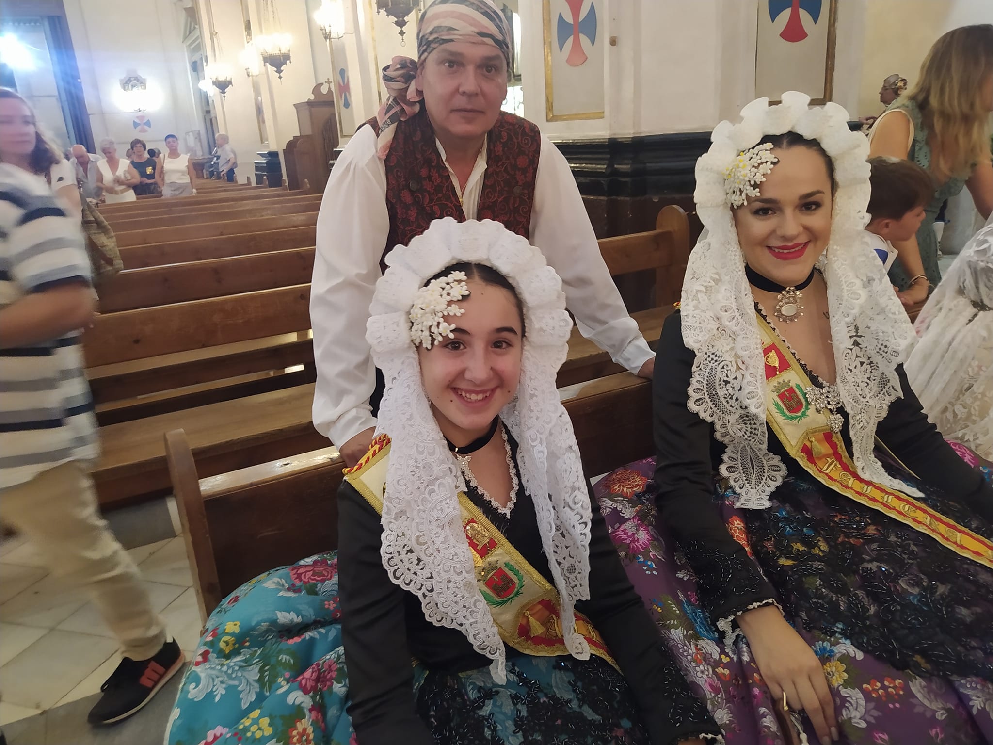 Lucía e Imara falleras mayores de Elda, acompañadas por Juan Pérez miembro de Junta Gestora, han participado en Monóvar a la ofrenda de flores con motivo de sus fiestas mayores.