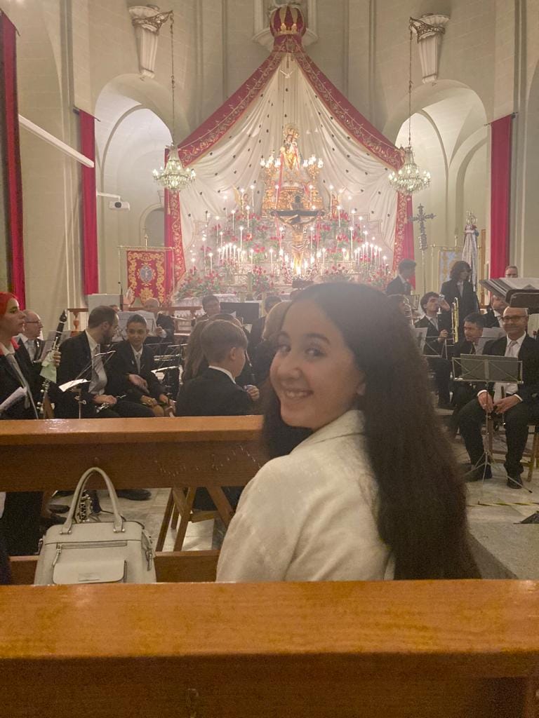 Imara Lencina, fallera mayor infantil de Elda acompañada por la presidenta de Junta Gestora Isabel Martínez, han asistido, en la iglesia de Santa Ana, a la serenata de la Virgen de la Salud.