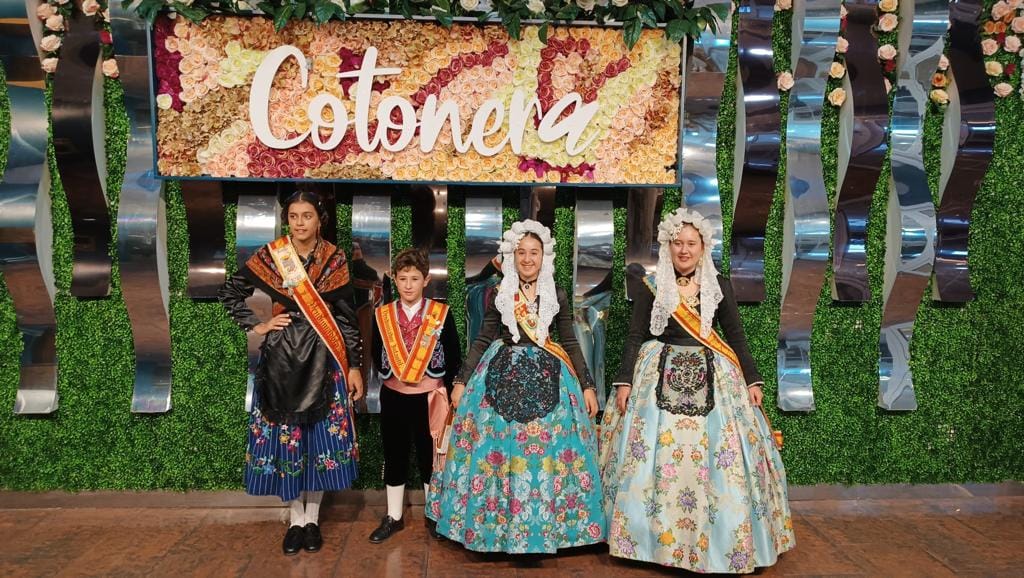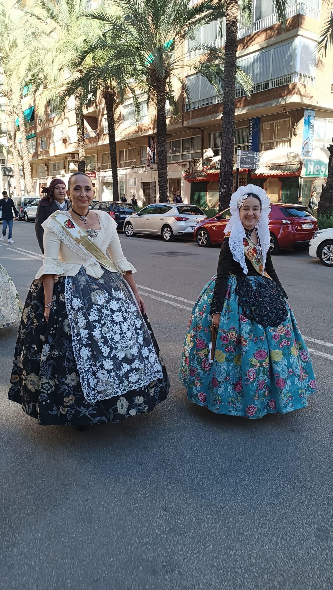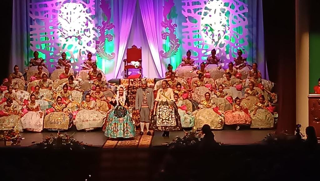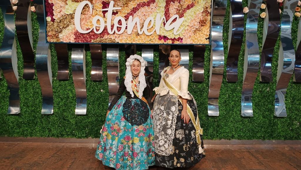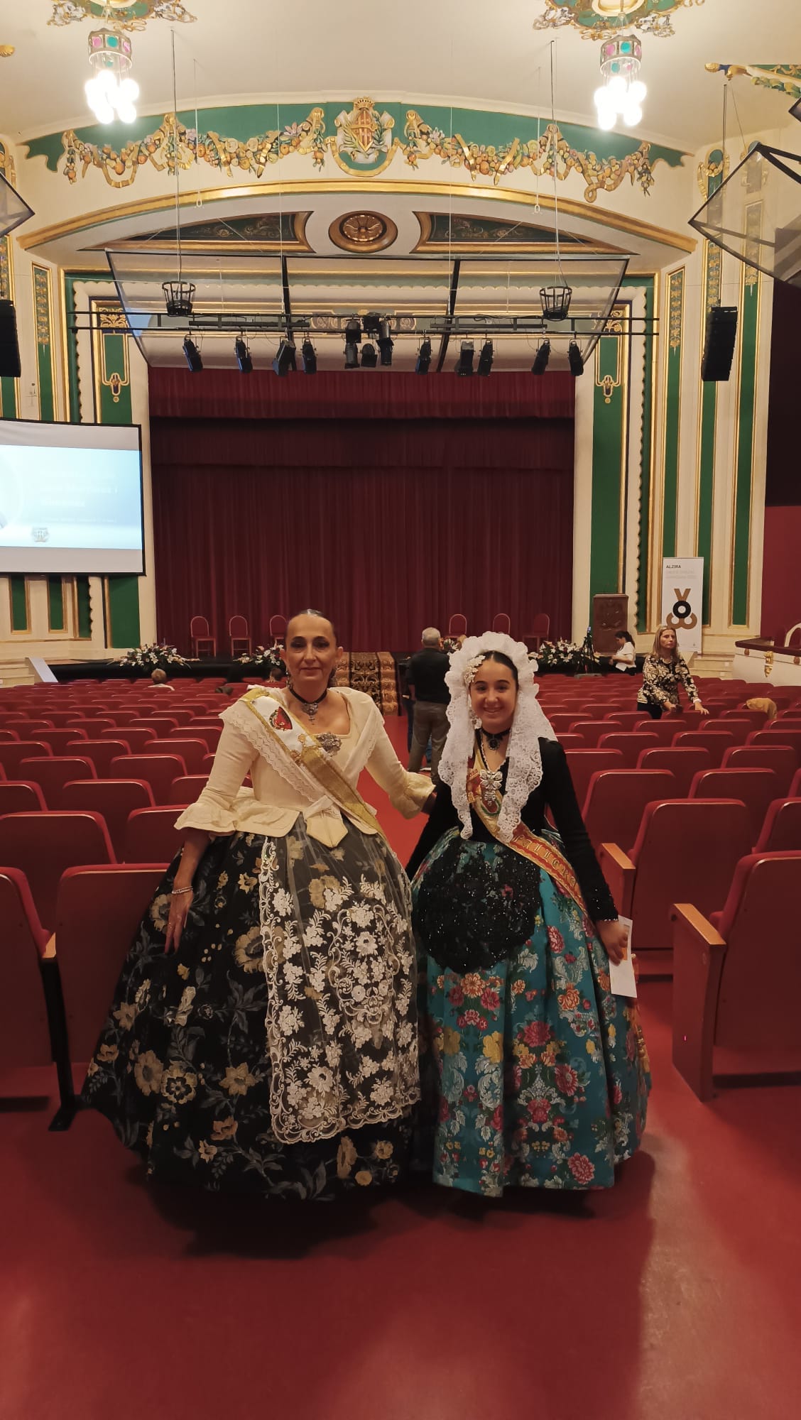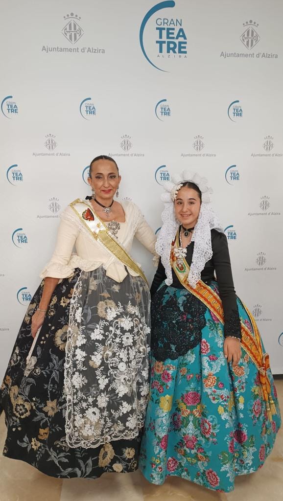 Imara Lencina, Fallera Mayor infantil de Elda acompañada por Isabel Martínez presidenta de Junta Gestora, han asistido a la exaltación de Sara Martínez, Fallera Mayor infantil de Alzira 2023.