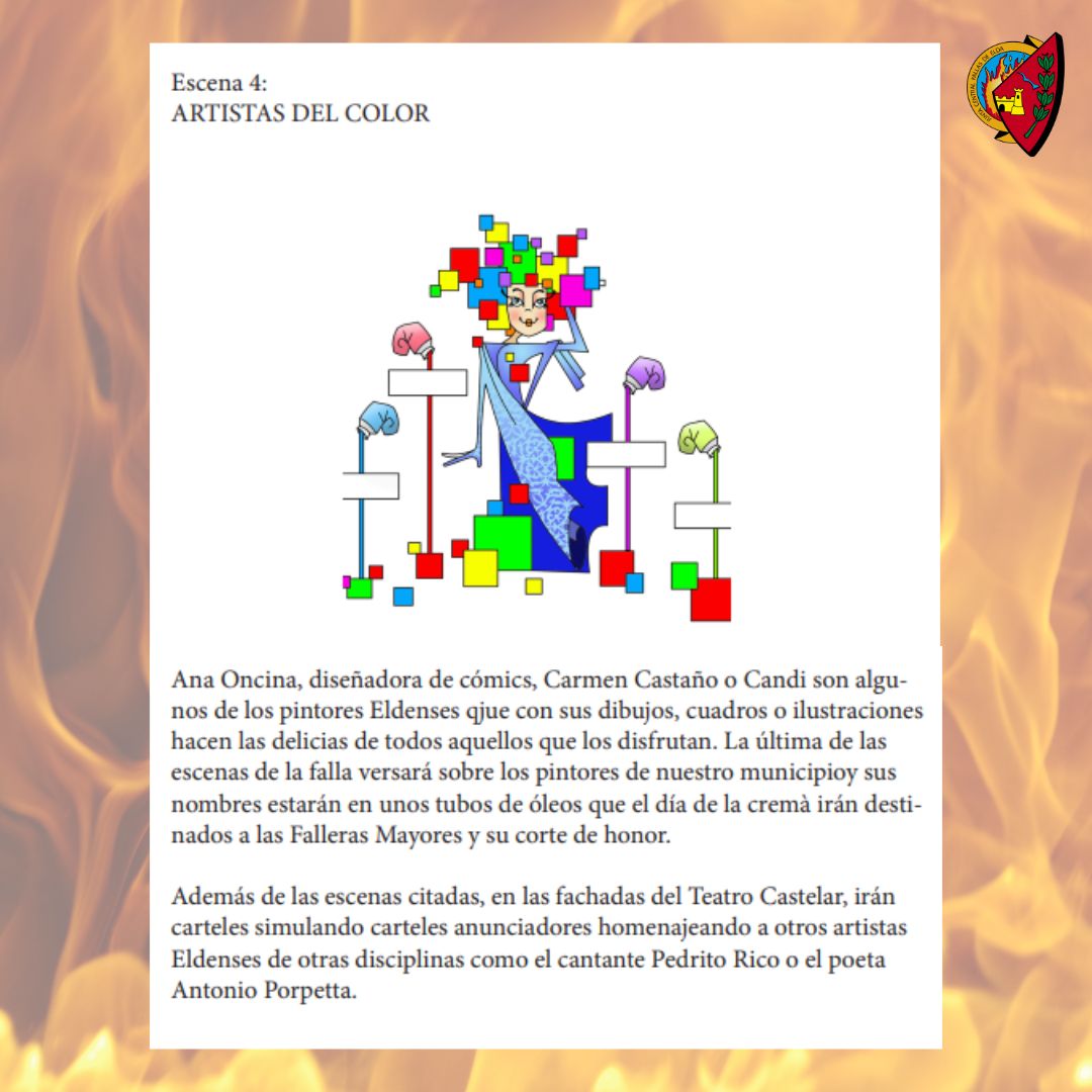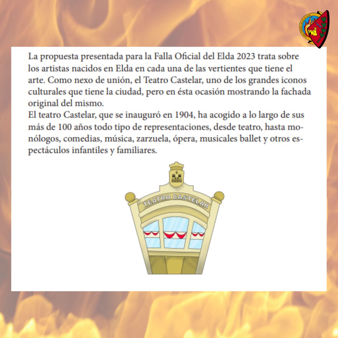 El acto, que estuvo lleno de expectación y emoción, culminó con la presentación del boceto de la Falla Oficial, que será plantada en la emblemática plaza del ayuntamiento el miércoles 20 de septiembre. Este año, la Falla Oficial será un homenaje en toda regla a la grandeza y la historia de Elda. La figura de Antonio Gades y el Teatro Castelar serán los protagonistas de escenas que celebrarán a los artistas locales en diversas modalidades.