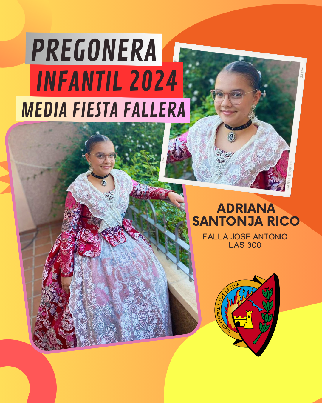 Con el propósito de darle un nuevo impulso a la participación infantil en nuestras celebraciones, Junta Central de Fallas de Elda ha designado a Adriana Santonja Rico, una festera niña de 13 años perteneciente a la Falla José Antonio Las 300, como la primera pregonera infantil en la historia de nuestras fiestas. Adriana, quien ha estado profundamente involucrada en la vida fallera desde su infancia, ha destacado como Fallera Mayor infantil en 2019 y actualmente ocupa el cargo de presidenta infantil de su comisión. Estamos seguros de que Adriana, con su carisma y pasión por nuestras tradiciones, emocionará a todos con su discurso lleno de corazón durante el pregón.